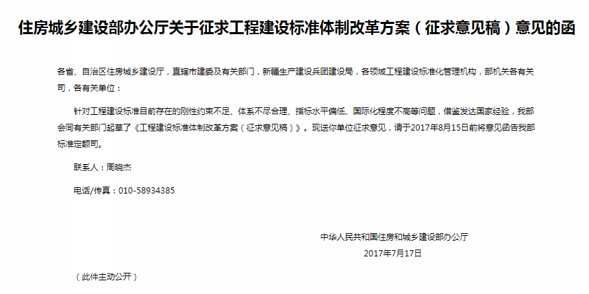 针对工程建设标准(以下简称“标准”)目前存在的刚性约束不足、体系不尽合理、指标水平偏低、国际化程度不高等问题,住房城乡建设部会同有关部门起草了《工程建设标准体制改革方案(征求意见稿)》,于近日发布。 改革目标 建立以工程建设技术法规(以下简称“技术法规”)为统领、标准为配套、合规性判定为补充的技术支撑保障新模式。 强化底线控制要求,建立工程规范体系 明确工程规范类别、层级。工程规范分为工程项目类和通用技术类;工程规范分国家、行业、地方三级。 精简政府标准规模,增加市场化标准供给 明确标准定位...